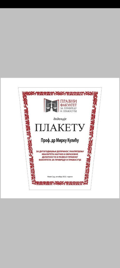 Na Nastavno-naučnom veću 10.10.2022. prof. dr Milan Počuča, dekan uručio je posebnu plaketu prof. dr Mirku Kuliću za dugogodišnji doprinos unapređenju kvaliteta naučne i obrazovne delatnosti i razvoju Pravnog fakulteta za privredu i pravosuđe.