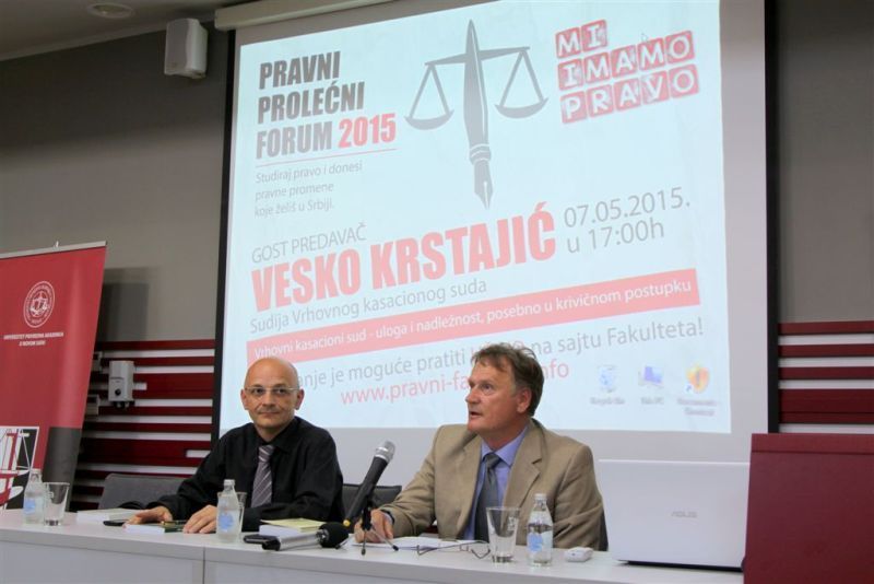 Na prvom pravnom forumu „Mi imamo pravo“ studenti Pravnog fakulteta, kao i svi ostali zainteresovani imali su priliku da kroz predavanje sudije Vrhovnog kasacionog suda Veska Krstajića čuju nešto više o ulozi i nadležnostima ovog suda, sa posebnim osvrtom na krivične postupke, odnosno na primenu novog Zakonika o krivičnom postupku.