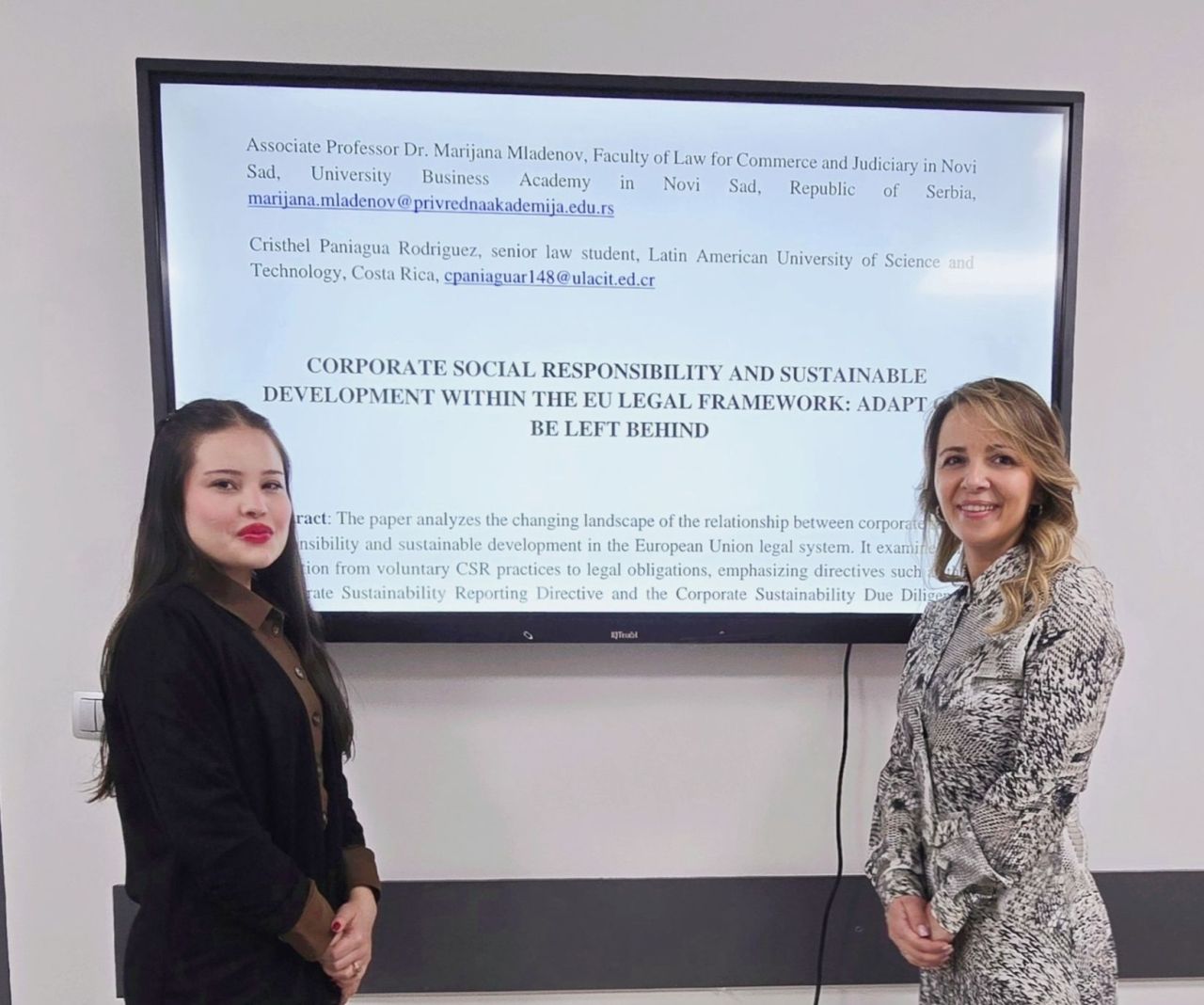 Koleginici Cristhel Paniagua Rodriguez želimo uspešan završetak studija na Fakultetu društvenih nauka Latinoameričkog univerziteta za nauku i tehnologiju iz Kostarike uz zahvalnost na ukazanom poverenju i nadi da je pored znanja stekla i lepe uspomene tokom mobilnosti na Pravnom fakultetu za privredu i pravosuđe u Novom Sadu.